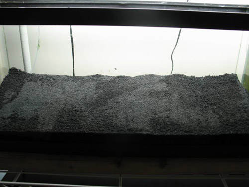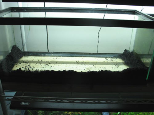 Now comes the fun part of setting up the aquarium. Add the gravel of your choice just along the front and side edges of the aquarium bottom. Wet it just enough that it holds a slope and press it up against the sides. Doing this step ensures that we will not see the different layers of substrate when viewing the tank from the front and sides. In this instance I have chosen to use 3M Colorquartz T-Grade Black Sand as a substrate top layer. I prefer this coarse sand for many reasons. It is very dense and holds a slope for a long period of time. The finer granules also allow for easy planting.