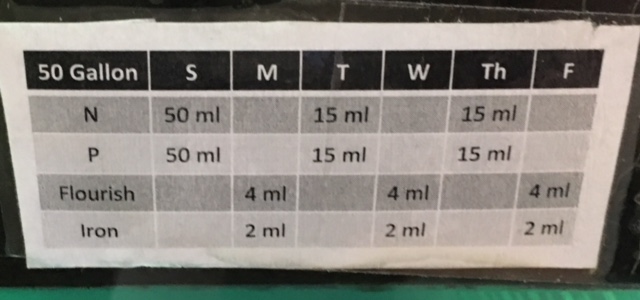 I like my autodosers, so I'm going to spread the dosing of the two macro solutions out evenly 7x per week, with the total volume of the dosage the same. For my 57 gal tank, I'll dose 57*3/7 = 24ml/day.